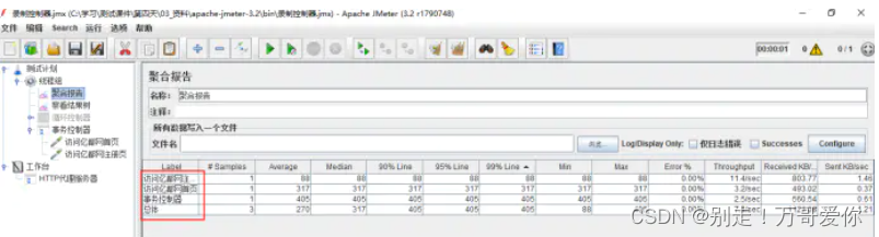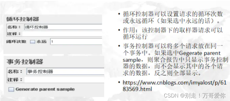 作用: 事务控制器会生产一个额外的采样器,用来统计该控制器子结点的所有时间。 在线程组下创建事务控制器 参数: · Generate parent sample:(选中这个参数结果展示如下图红框,否则显示为下图蓝框) · Include duration of timer and pre-post processors in generated sample:选中这一项会统计定时器(timer)的时间,否则只统计采样器(sample)的时间