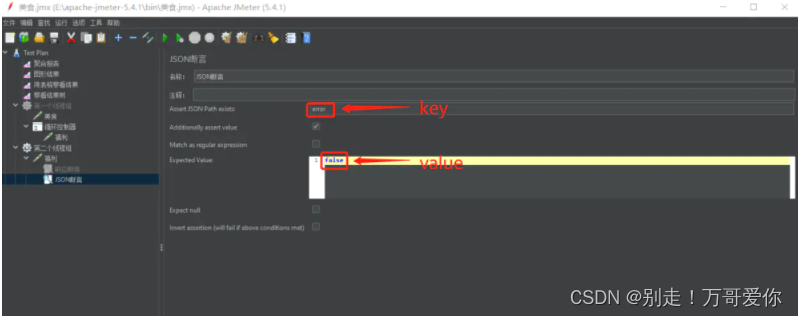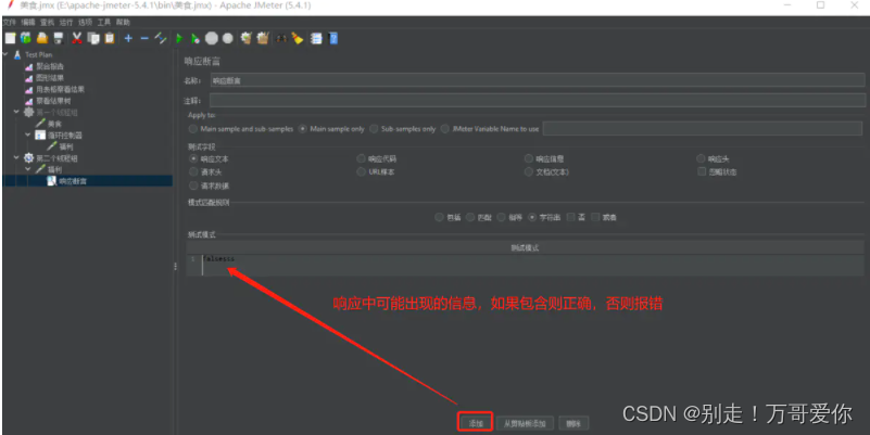 断言(Assertions)可以用来判断请求响应的结果是否如用户所期望的。它可以用来隔离问题域,即在确保功能正确的前提下执行压力测试。这个限制对于有效的测试是非常有用的。 两个重要断言:响应断言和JSONAssertion 响应断言: