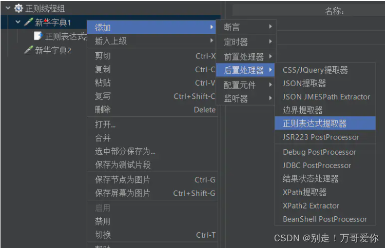 前置处理器(Pre Processors)和后置处理器(Post Processors)负责在生成请求之前和之后完成工作。前置处理器常常用来修改请求的设置,后置处理器则常常用来处理响应的数据。我们主要在动态关联中用到后置处理器的正则表达式提取器。 https://www.cnblogs.com/fengpingfan/p/4755411.html