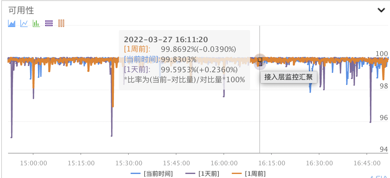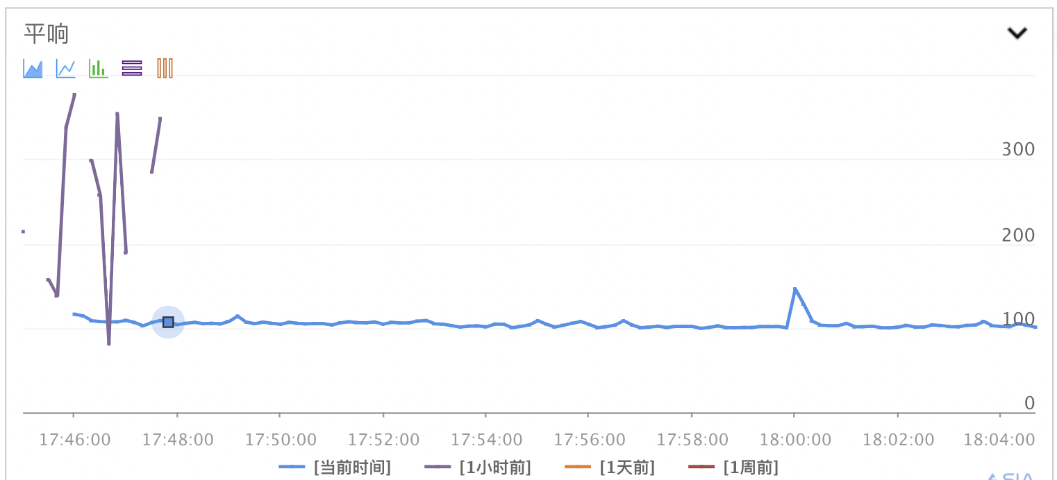 下面几张截图是监控平台上的指标趋势,下图为可用性,可以看到可用性基本是维持在98%-100%  下图为平均响应时间,基本是在100 ms