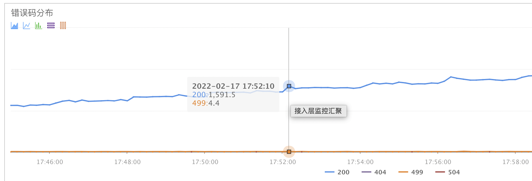 下图为PV,有时候还会采集PV lost数据指标,PV lost是对服务器日志中的status为500状态码的日志做采集  错误码,正常接口返回错误码是200,下图当中有少量499、404、504的错误码
