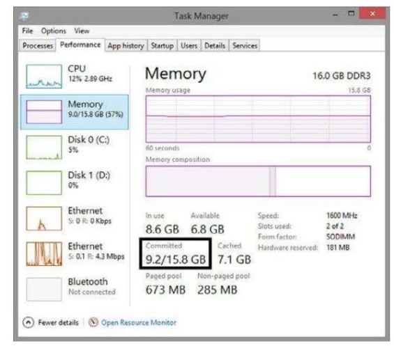 本章涵盖了您需要了解的有关系统提交的内存、如何监视此资源以及如何对其进行故障排除的知识。 如果您曾经看到一条弹出消息说系统“虚拟”内存不足,那么这意味着系统无法使用物理内 存和页面文件来支持任何进一步的内存需求。当系统处于这种状态时,提交的内存分配更有可能失败,从而导致应用程序无法启动,并且已经运行的服务、应用程序和驱动程序可能会开始出现故障。因此,跟踪系统提交的内存使用情况非常重要 系统提交限制是物理内存和系统上组合的所有页面文件大小的总和  当 system commit charge大约超过系统提交限制的 90% 时,页面文件将增加以适应它。这将继续发生,直到页面文件达到物理内存大小的三倍或 4 GB,以较大者为准。这一切都假设磁盘上的系统分区足够大以容纳该大小的页面文件。 下图系统提交限制15.8GB,system commit charge 9.2GB  性能监视器有三个与系统提交内存相关的计数器,\Memory\Commit Limit、\Memory\Committed Bytes 和\Memory% Committed Bytes In Use 保证对系统已提交内存进行更多调查的初始指标是为计数器 \Memory% Committed BytesIn Use 计数器寻找大于 75 的值。大于75则列为警告,小于90则列为严重。 所有系统提交的内存都到哪里去了?以下是可能消耗系统已提交内存的常见嫌疑人的列表。 1.处理私有内存,包括Address Windowing Extensions (AWE)内存使用 2. 内核池内存 3. 驱动程序锁定内存 4. System committed backed shared memory windbg的“!vm”显示 Process Private Memory:系统提交内存最常见的消费者是进程。进程需要已提交的内存才能运行,繁忙的应用程序进程消耗很大一部分系统已提交的内存是正常的。尽管如此,重要的是要跟踪哪些进程消耗最多。进程私有内存可以通过许多工具进行跟踪,例如任务管理器、资源监视器和 Sysinternals的Process Explorer。性能计数器是\Process(*)\Private Bytes,最接近的 WMI 属性是Win32_Process.PageFileUsage。 驱动程序锁定内存:例如虚拟化驱动程序、防病毒或反恶意软件驱动程序、显卡和磁盘驱动程序。驱动程序锁定内存的常见消费者是虚拟化软件 SYSTEM COMMITTED BACKED SHARED MEMORY SECTIONS:一个进程可以创建一个共享内存部分来与另一个进程共享内存,这种内存分配将立即增加系统提交费用。在内核调试器中使用命令“!vm 1”检测共享的已提交内存——Shared Commit SYSTEM CACHE RESIDENT MEMORY:系统缓存消耗物理内存,但不计入system commit charge 内核池内存:查看 Pool Paged的使用情况并不能直接指示系统提交的内存使用情况,因为上面提到的计数器和值正在测量保留和提交的内存使用情况。对于 Pool Paged 正在使用的系统提交内存的真实数量,请使用带有“!vm”命令的内核调试器并查看 PagedPoolCommitted 字段。