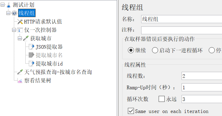 查看结果树,发现这个仅一次控制器控制的是循环次数,线程数没办法控制,两个线程数,执行了两次获取城市。 后来学到了全局变量,jmeter线程也有setUp和tearDown,还有最常用的线程组,执行顺序先setUp,然后线程组,最后tearDown。 这里先获取城市,就可以写setUp里,然后还用正则表达式提取器或者json提取器,取出城市名,再多一步,把城市名设为全局变量。
