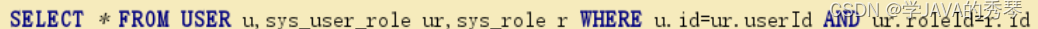select u.,r.,r.id rid from user u left join user_role ur on u.id=ur.user_id? inner join role r on ur.role_id=r.id;