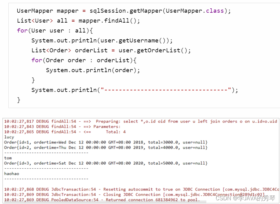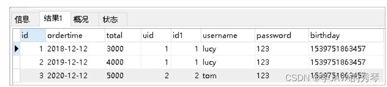 2.查询语句:select * from orders o,user u where o.uid=u.id;