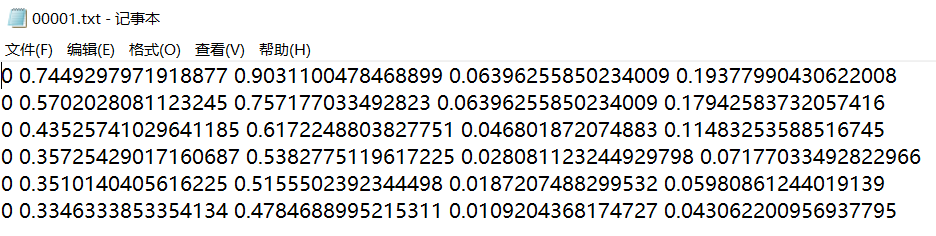 前面的0代表类别 举个例子 我们检测图片 里面有三个动物 分别是狗 猫 牛那我们就把狗当作0 猫 当作1 牛当作2 这样计算机很容易明白 0后面有四个数字 代表这个类别出现的位置,其实也就是矩形框