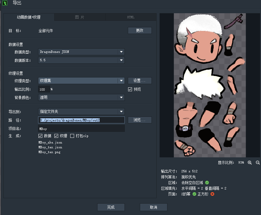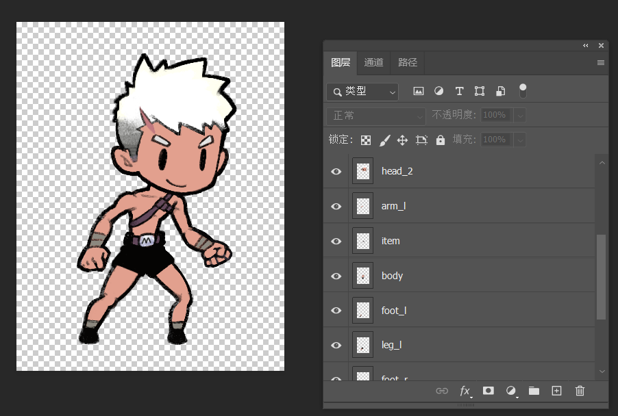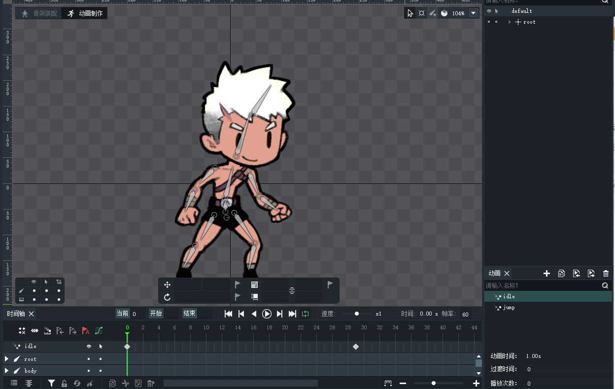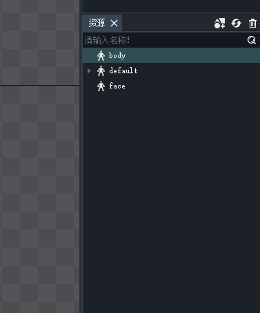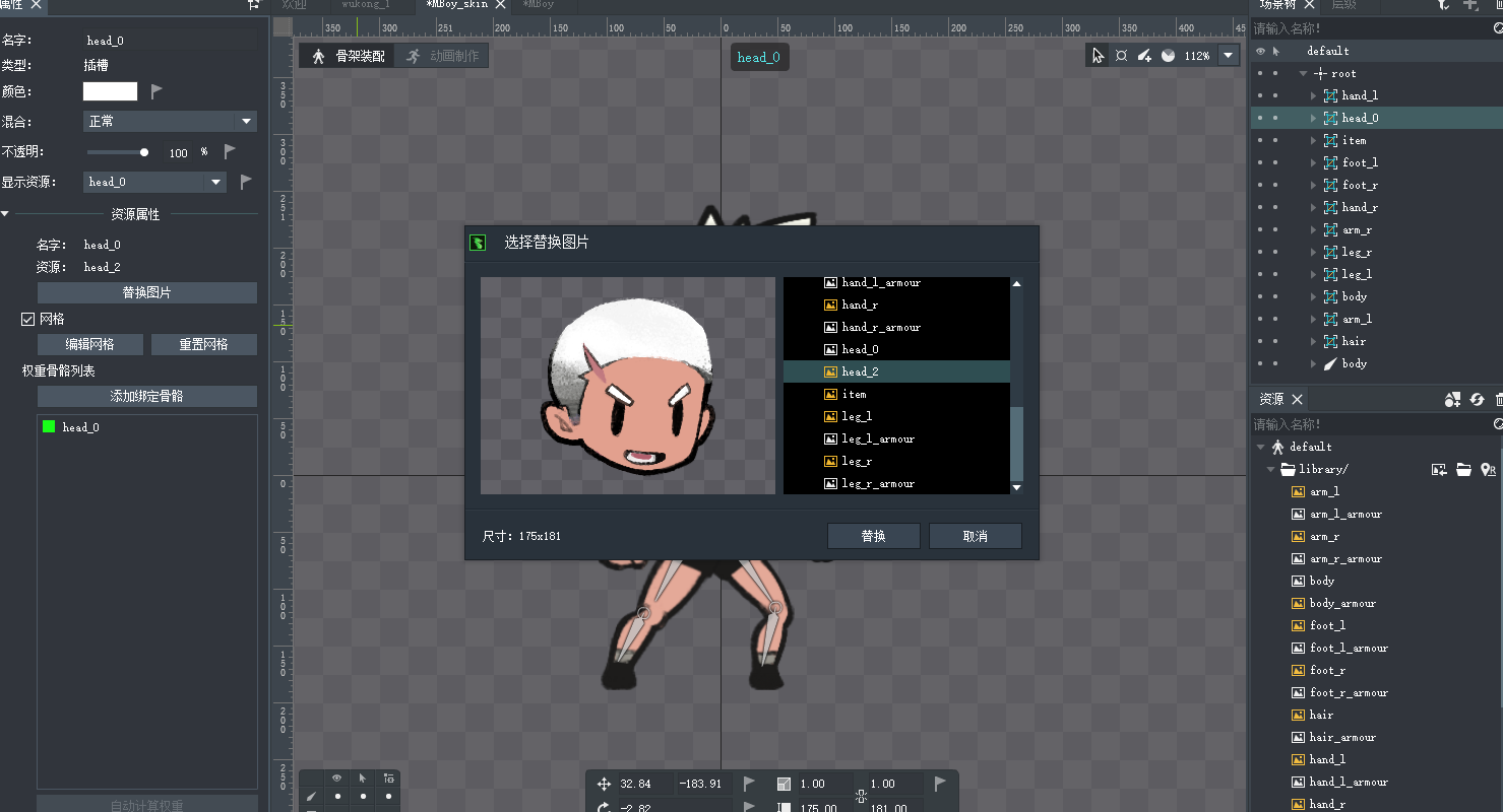 首先要获得图片资源,从ps中得到分层数据后,导入龙骨。一个角色有多套皮肤资源,可以先导入到龙骨的同一个项目中,这样之后在library里就可以直接替换不同位置的图片  导入龙骨后,绑定骨骼,制作动画,相关教程有很多。我们为这个角色制作了idle和jump两个动画。  接下来复制这个原件,有几个要替换的部位就复制几个。这里替换脸和身体两个部位,那么就复制两个,一个取名为face、一个取名为body,原来的原件改名为default,如下:  双击face元件,将骨骼下的插槽全部拖拽到root骨骼下,删除所有和皮肤无关的插槽,用下面的方法将要用的插槽与原骨骼重新绑定: 点击网格、添加绑定骨骼,在画布或树形图中选定要绑定的骨骼,然后双击确定。这里分离插槽和骨骼后,将头部插槽与头部骨骼重新绑定。 之后删除所有无关的骨骼和动画。删除动画的方法是新建一个新的动画取名为NULL,删除所有原有的动画。 同样的方法,制作body部位的皮肤。  制作好之后,导出,选择所有元件  另存为一个新的项目,下面要制作另一套皮肤。将脸部图片和身体图片替换:选择对应的插槽然后替换图片即可。如果找不到替换的图片,从ps里导入图片素材到此项目的library中即可。  替换之后,删除所有动画,直接导出,得到另外三个导出文件。至此,我们得到两套文件: