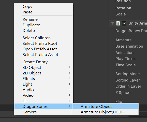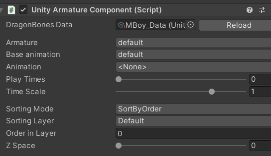 在unity中,首先导入龙骨插件,接着在Resources文件夹下新建文件,结构如下  将两套导出文件分别拖入DragonBones文件夹下。 新建龙骨物体,选择ske json文件,点击create,就得到默认的游戏物体,将sortingMode改为 SortByOrder。Armature选default。