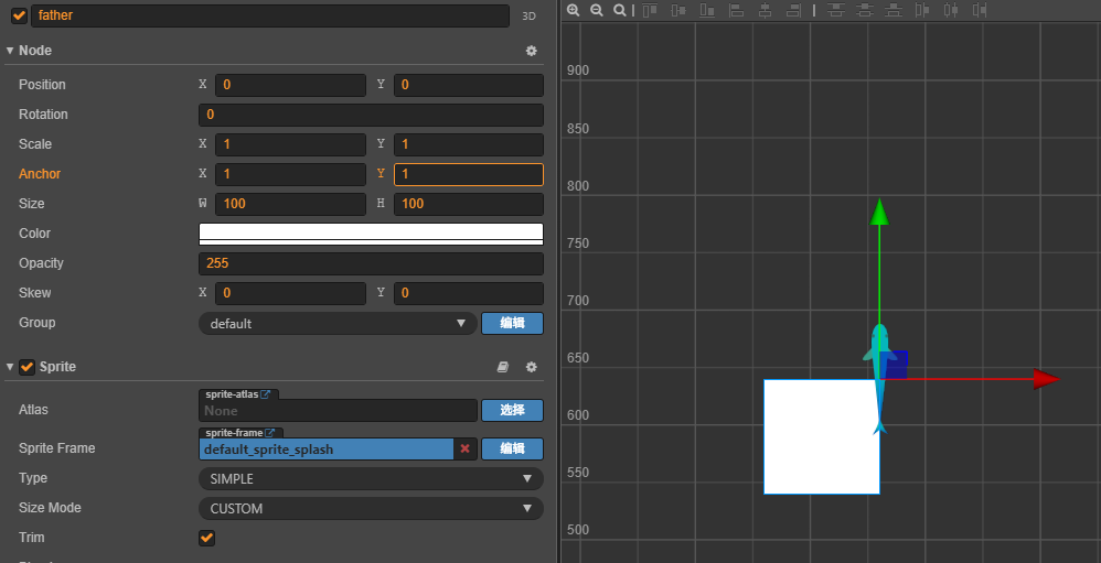 比如我建立一个父节点father,白色底,儿子son节点是一个鱼的精灵图片。  显示的效果:  可以看到他们都在我们画布上的中心点上,x=0,y=0.做个实验改变father节点的锚点为(1,1)也就是father白色背景的右上角为基准点, son节点也跟着到了father白色背景的右上角。 我们可以得出,父子节点的关系是: