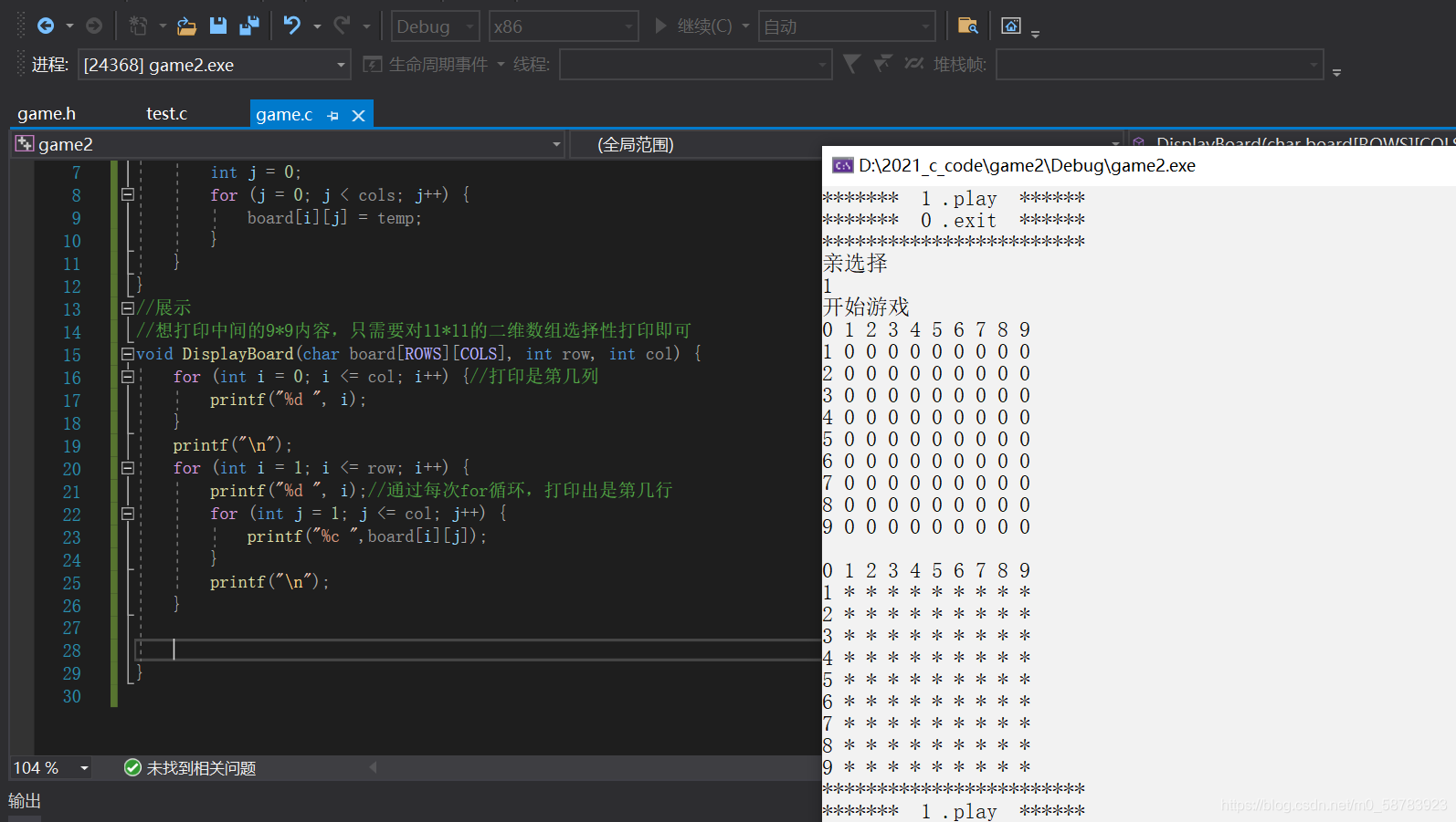 细节一:由于数组是11*11的,但是我们只要中间的9*9部分的内容,所以,我们要对已经初始化的数组进行范围性打印,即打印下标为1到ROW 行以及下标为1到COL列的数组元素