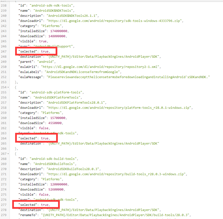 大概在240行左右的内容就是关于安卓包的,有好多,由于之前下载过,这边都全部显示为true,所以模块里面也显示为已经下载,只需要把后面android相关的都修改selected的值为false就可以了(注意:这里的visible属性其实就是在包管理器中是否可见,默认是三个为可见的),然后重启unity hub就能够重新勾选了。  然后重新勾选下载就能完成对应模块的安装了,这里建议先安装AndroidSupport,再安装sdk和openjdk,因为我是一起勾选安装的,但是最后下载完发现好像jdk和sdk文件夹不见了,所以为了避免这样的问题,可以按我说的试一下。