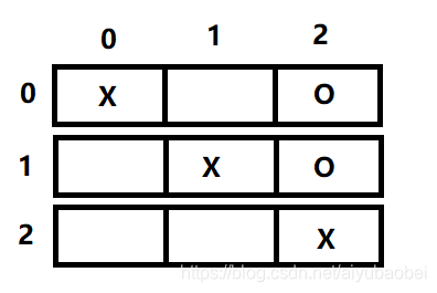 ?到这一步,这个游戏大的框架就成型了。接下来我们就来实现游戏的功能,首先我们要把井字棋的棋盘先打印出来。这就需要我们用到二维数组,我们先创建一个字符二维数组,并把它初始化为全是空格的数组。为什么要用字符数组呢?那是因为我们这个数组里面存放的是玩家下的棋子和电脑下的棋子。大概的意思如下图:
