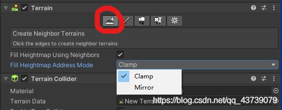 选中创建邻近地形,在Scene面板中点击四周绿色的线框可以在线框处创建另一块地形(新地形被创建出来后与模板地形不处于同一块地形中),并新建一个新的TerrainData资源,编辑器会默认将新创建的地形区块放在与其邻近地形区块所在的那个组中,并复制邻近区块的设置给新的地形。 当勾选Fill Heightmap Using Neighbors时表示使用已经存在且与其相邻的地形高度图交叉混合来填充新地形的高度贴图。Fill Heightmap Address Mode表示选择交叉混合地形高度图的模式。