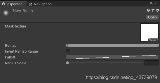 Mask Texture | 定义画笔的形状和强度。在项目中选择纹理,系统将根据纹理创建灰度遮罩。如果所选纹理具有多个颜色通道,则画笔将使用红色通道作为其源。 | Remap | 应用衰减 (Falloff) 曲线后重新映射画笔遮罩的灰度值。Editor 将画笔遮罩中的黑色值重新映射到您使用滑动条左侧选择的值,并将画笔遮罩中的白色值重新映射到使用滑动条右侧选择的值。 | Invert Remap Range | 反转 Remap 滑动条的左侧和右侧,本质上是反转整个遮罩的值。 | Falloff | 定义以圆形方式影响画笔强度的曲线。单击衰减 (Falloff) 曲线可打开 Unity 曲线编辑器 (Curve Editor),然后可以在其中编辑该曲线以创建平滑淡入淡出和锐利边缘等各种效果。 | Radius Scale | 影响衰减曲线的比例。使用此选项可增大或减小曲线的半径。 |