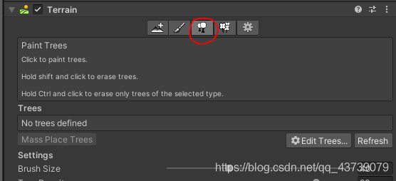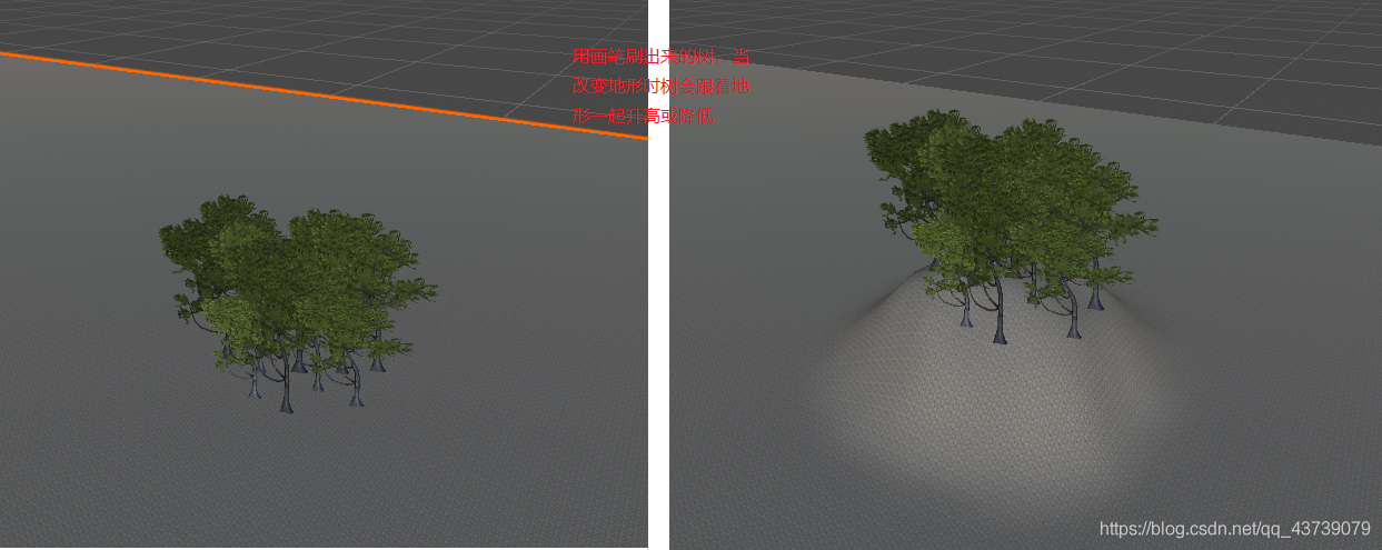 地形中最初没有树,需要先添加树原型后才能使用,能添加多个树原型。  操作方式:可以使用笔刷工具将定义到地形中的树刷到地形区块中。添加树后,单击并拖动添加树,Shift+单击并拖动擦除画笔覆盖区域的所有树,Ctrl+点击并拖动擦除画笔覆盖区域内当前选中的树类型。
