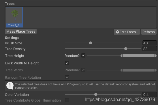 Mass Place Trees | 创建一批整体覆盖的树,但不绘制在整个地形上。批量放置树后,仍然可以使用绘制功能来添加或移除树,从而创建更密集或更稀疏的区域。 | Brush Size | 笔刷大小。 | Tree Density | 树的密度。 | Tree Height | 树的高度,勾选Random并修改Random后的滑动条时,树的高度会在滑动条范围内随机。 | Lock Width to Height | 勾选这个选项会将树的高宽比锁定,当树的高度随机时,树的高宽比会保持和预制体一样。 | Tree Width | 树的宽度,勾选Random并修改滑动条后随机,只有当取消勾选Lock Width to Height 时有效。 | Random Tree Rotation | 树的旋转,只有当选中的树有LOD组时才支持旋转,否则将使用默认的视点替用特效系统,并且不支持旋转。 | Color Variation | 树的颜色变化,值越大区域内树的颜色变化越大 | Tree Contribute Global Illumination | 启用此复选框可向 Unity 指示树影响全局光照计算。 |