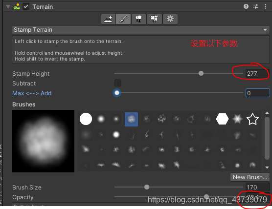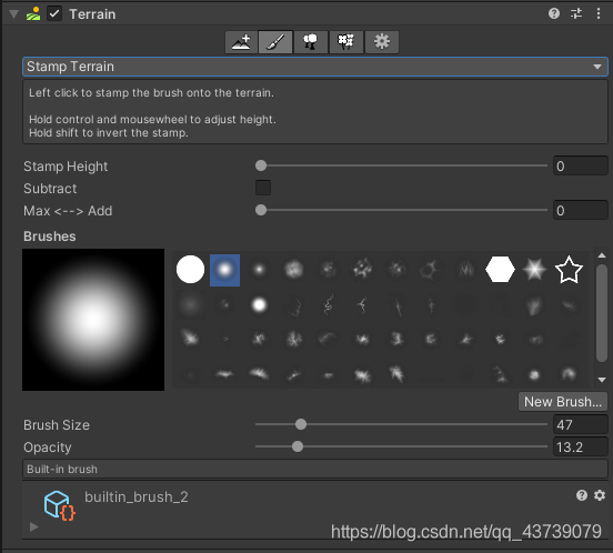 如果想要将特定地质特征(例如山丘)按照比例绘制到地形上,可以使用该工具绘制。但是需要先使用需要绘制的特征纹理创建自定义画笔(具体内容看1.2自定义画笔)。  创建自定义画笔:选择New Brush后选择要绘制的纹理高度图,即可根据高度图创建一个画笔,这个画笔包含高度图的信息,例如,有一座山的高度图,根据此高度图创建的笔刷保存这座山的形状、高度、各丘陵的突起等信息。  使用 Stamp Terrain 工具可以选择现有画笔并只需单击即可应用画笔。每次单击都会以所选画笔的形状将地形升高到设置的 Stamp Height。移动 Opacity 滑动条将 Stamp Height 乘以一个百分比。例如,Stamp Height 为 200 且 Opacity 为 50% 时,每个标记的高度设置为 100。  Max <–> Add 滑动条用于选择最大高度,还是将标记的高度添加到地形的当前高度。