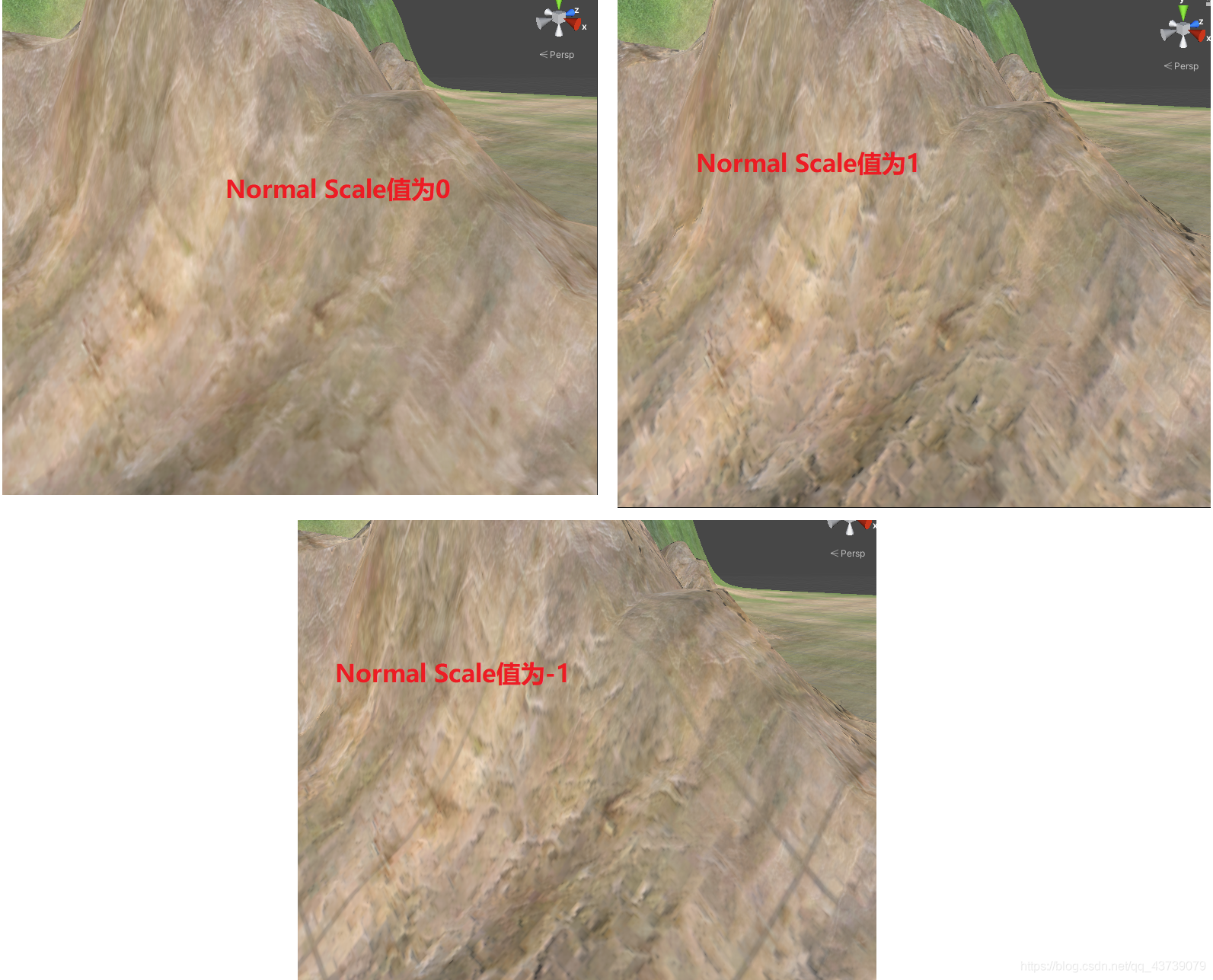 Normal Scale 如果设置了法线贴图纹理,地形图层设置中将出现一个 Normal Scale字段 ,修改该字段的值可以修改法线贴图中的法线值的缩放因子,即可以修改显示纹理中的凹凸度、粗糙感。值为 0 时没有凹凸感,值为非0数时凹凸度都增加。区别在于,值为正数和负数时对应的凹凸方向发生改变。
