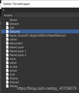 选择Edit Terrain Layers->Create Layer,选择一张纹理图片后即会添加一个Terrain Layer到资源面板,纹理名称及路径可修改。  -