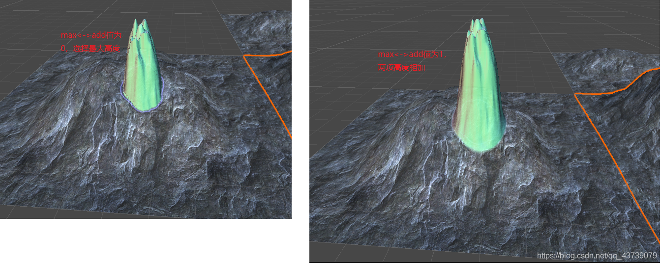 0 | Unity 会将标记的高度与标记区域的当前高度进行比较,并将最终高度设置为二者中较高的值。 | 1 | Unity 会将标记的高度与标记区域的当前高度相加,因此最终高度设置为两个值之和。 | 0~1之间 | Unity会计算出标记高度与Max <–> Add值的乘积,再将其加在最大高度上。 |