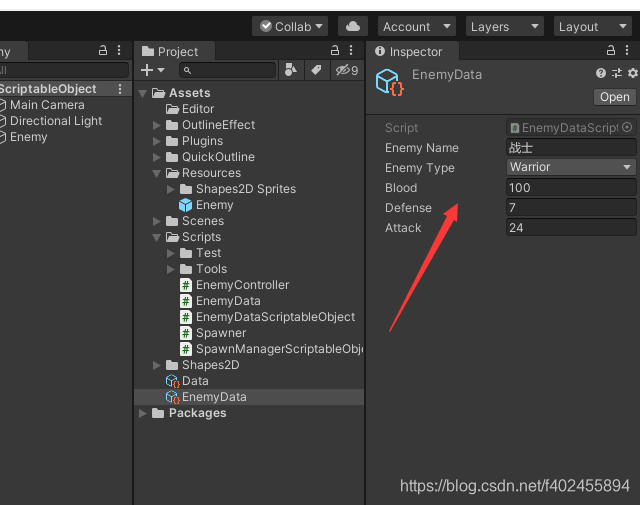 ?实例完成后生成EnemyData.asset文件,编辑文件中的数据。