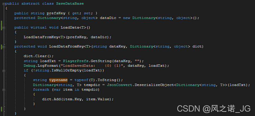 作为一个Unity 开发人员 我们在开发过程中经常会用到存档的功能,存档结构比较简单时,我们可以直接通过PlayerPrefs的set进行存储,当我们的存档结构比较复杂的时候就不能再使用直接set的方式进行存储了 因为那样会导致存档结构很混乱,不易于后期查找维护。 今天我就分享一个我所知道的一个简单的存储方式。 我的存储结构还是基于PlayerPrefs 只不过是对存储的数据进行了序列化 1、第一步 导入Json序列化插件 直接在unity资源商店搜索下载即可,是免费的 下载完直接导入  2、第二部 定义存档结构(参考图片阅读) 我的存档基类为一个抽象类 然后所有的存档类都继承此抽象类 每个子类都有对应的唯一的存档Key 定义一个字典取名dataDic,这个字典用来存储每个不同存档的数据(例如我们有家具的存档,物品的存档 都是不同的key) 定义一个泛型的虚方法LoadData 加载存档, 虚方法中调用了LoadDataFromKey 此方法才是具体的加载存档 为保证脏数据的问题 我们在加载之前先对我们的字典进行Clear(); 因为我们存档存的所有数据最后都是以字符串的形式存在PlayerPrefs中,所以我们加载存档的时候首先需要将存档取出来 如果存档为空的话 那我们就不做处理 接着我们使用我们的Json序列化工具中的JsonConvert.DeserializeObject将我们的存档字符串解析成一个泛型的字典,通过foreach遍历添加到我们的存档字典dataDic中 这个就是读取存档的全部步骤了   存 存档的话就直接将dataDic通过JsonConvert.SerializeObject转成字符串存入存档。 我在基类里开放了三个公共方法ClearData SaveData InitDefault 需要清除和存档时就直接通过子类调用SaveData ClearData 就行了 至于InitDefault 是用来设置初始数据的 在创建存档对象的时候统一调用一下就行了  至此存档的基本结构算是定义完了 但是想要使用的话 我们需要将我们的存档对象创建出来(都是唯一的)接着 InitDefault 。 注意:dataDic中的数据全部是object形式进行存储的。还有就是这里只是定义了存档的基本结构,具体的增删改查还需要自己根据需求去实现,这里就不进行讲解了。 下一章我们会对一个具体的存档进行讲解。