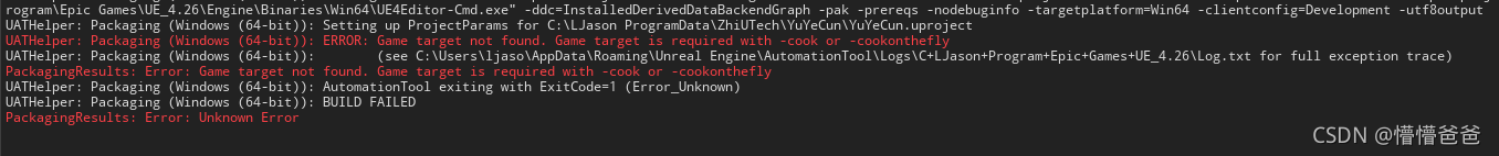 UATHelper: Packaging (Windows (64-bit)): ERROR: Game target not found. Game target is required with -cook or -cookonthefly UATHelper: Packaging (Windows (64-bit)): ? ? ? ?(see C:\Users\ljaso\AppData\Roaming\Unreal Engine\AutomationTool\Logs\C+LJason+Program+Epic+Games+UE_4.26\Log.txt for full exception trace) PackagingResults: Error: Game target not found. Game target is required with -cook or -cookonthefly UATHelper: Packaging (Windows (64-bit)): AutomationTool exiting with ExitCode=1 (Error_Unknown) UATHelper: Packaging (Windows (64-bit)): BUILD FAILED PackagingResults: Error: Unknown Error