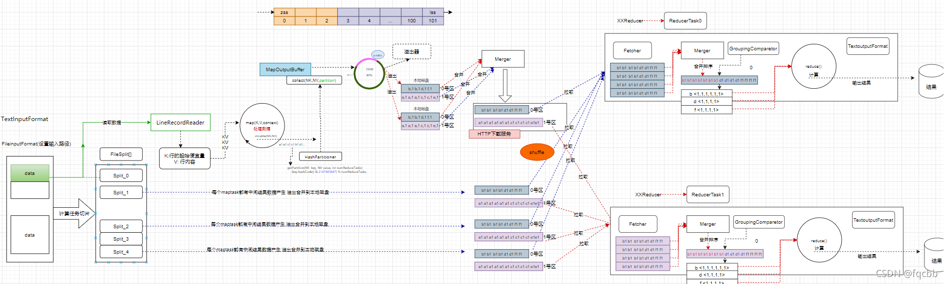 通过FileInputFormat的实现类TextInputFormat类的LineRecordReader方法来读取数据(以KV的形式). map方法在执行时是在一个循环中(Mapper类的方法中的循环) 每读取到一组KV,map执行一次.处理数据KV,生成新的KV,并通过context将数据写出. 数据被MapOutputBuffer类的collect方法收集起来,经过HashPartition类的getPartitioner方法,获取到一个分区编号,返回给collect. (new key,new value,int partioner) 新数据写到环形缓冲区(数组),只会写到80%,并且根据分区编号,进行区内排序(字典顺序排序),写到80%后,数据就会通过溢出器,将这些数据溢出到本地磁盘. 磁盘上的数据经过Merger组件将相同区的数据进行合并排序(数据依旧在本地磁盘) 数据在本地,外界不好拿取,这里会提供javaWebHttp的下载服务 reduceTask通过这个服务将属于当前分区的数据通过fetcher这个组件拉取(shuffle)过来. 拉取过来后,会经过merger组件将数据进行合并排序. 在经过GroupingConmparetor组件分组,相同key,value被放到迭代器中. 执行reduce方法,输出结果(TextOutputFormat指定输出路径).