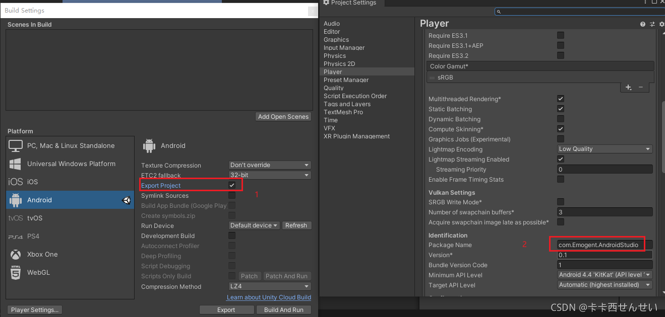 - Unity中修改两处设置后导出项目