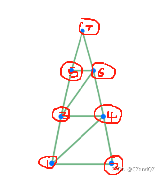 ?最终得网格就如图所示,蓝色代表顶点,绿色边构成得三角形代表网格顶点绘制得顺序。顶点的添加顺序是从下到上,从左到右,所以顶点的下标依次从0到6,所以顶点的添加顺序为