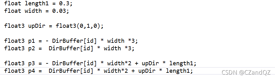 方法中的id可以理解为每棵草在一个草数组中的索引,在这个内核里面我们需要计算出每一个草的顶点相对位置这个位置是一个相对位置而不是绝对位置。首先假定最下面的坐标为a1和a2,假定a1和a2的距离为1,定义a3和a4的距离为0.5,定义dir12为a1-a2,dir34为a3-a4这里dir12和dir34向量是平行的 这里假定dir12到dir34向量的距离为0.1,dir12和dir34所在平面垂直z轴,所以我们额可以求出a3和a4顶点坐标。