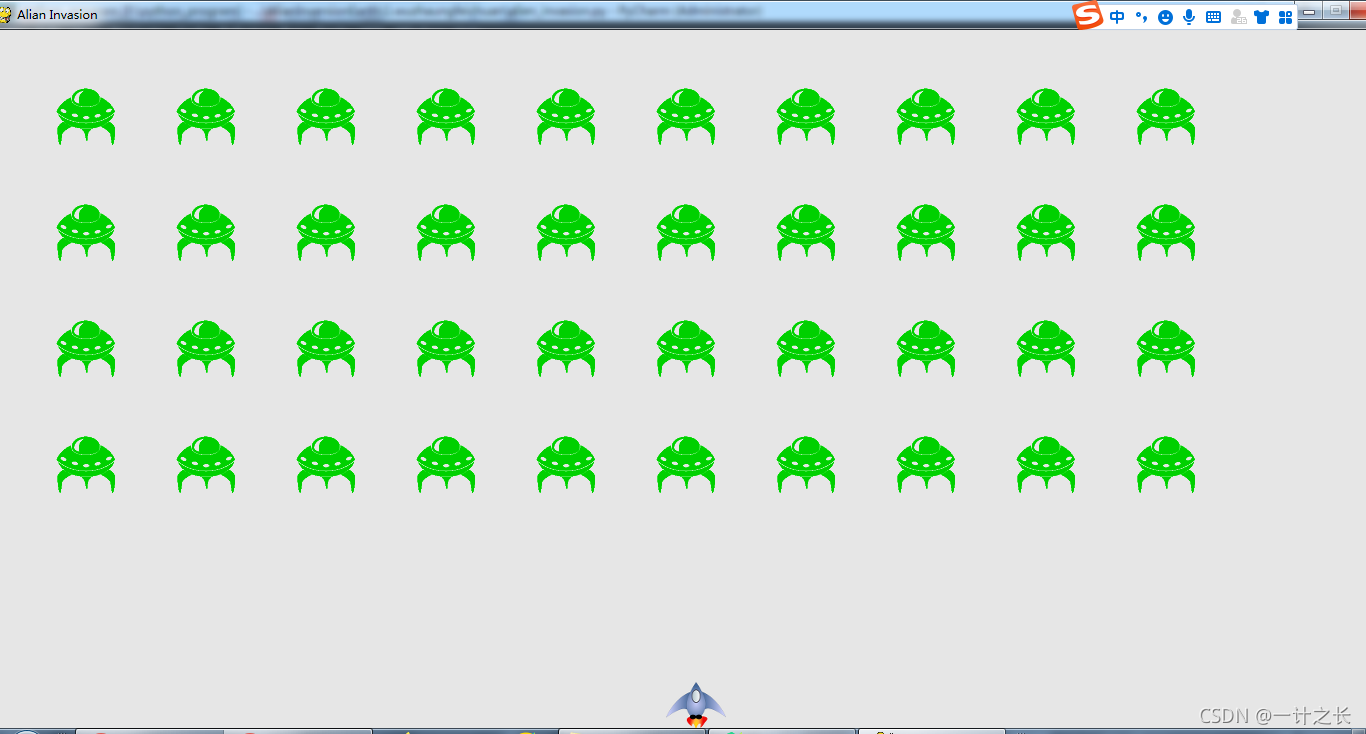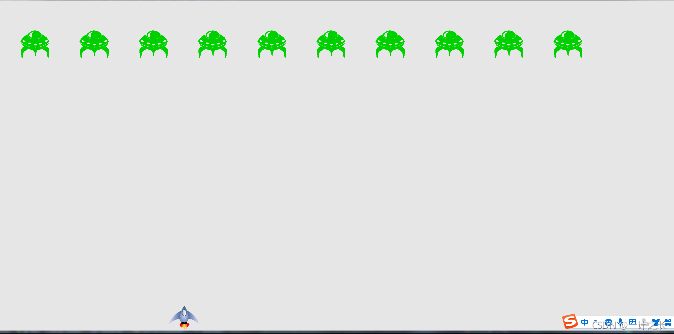 ??这些代码在前面其实我们都给大家详细介绍过。我们对编组调用draw() 时,pygame自动绘制了编组的每个元素,绘制位置由元素的属性rect决定。在这里,aliens.draw(screen) 在屏幕上绘制编组中的每个外星人。 ??我们为了放置外星人,需要知道外星人的宽度和高度。因此在执行计算前,我们先创建一个外星人。这个外星人不是外星人群的成员,因此,没有将它加入到编组aliens 中。另外,我们从外星人的rect属性中获取外星人的宽度,并将这个值存储到alien_width 中,以免反复访问属性rect。最后,我们计算可用于放置外星人的水平空间,以及其中可容纳多少个外星人。 ??相比于前面介绍的工作,这里唯一的不同是使用了int 来确保计算得到的外星人数量为整数,因为我们不希望某个外星人只显示一部分,而且函数range() 也需要一个整数。函数int()将小数部分丢弃,相当于向下取整,其实这样做最大的好处就是可以流出一些空间,而不是挤满了外星人 。看起来很少不好看。 ??最后,我们编写一个循环,它从零数到要创建的外星人数。在这个循环的主题中,我们创建一个新的外星人,并通过设置x坐标将其加入当前行。将每个外星人都往右推出一个外星人的宽度。接下来,我们将外星人宽度乘以2,得到每个外星人占据的空间,这里当然也包含其空白的区域,再据此计算当前外星人在当前的位置。最后,我们将每个新创建的外星人添加到编组aliens 中。 ??我们将目前代码运行,其效果如下:  ??这一行外星人在屏幕上稍微偏向了左边,这其实是比较好的,因为我们将让外星人群往右移,触及屏幕边缘后稍微往下移,然后往左移,以此类推。我们将让外星人群不断这样移动,直到所有外星人都被击落或有外星人撞上飞船或抵达屏幕底端。这里还需要我们特别注意的是:根据读者自己选择的屏幕宽度以及在你的系统中,第一行外星人的位置以及外星人个数可能不一样。