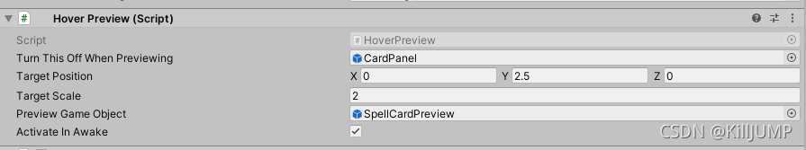 public class HoverPreview: MonoBehaviour { ? ? // PUBLIC FIELDS ? ? public GameObject TurnThisOffWhenPreviewing; ?// if this is null, will not turn off anything? ? ? public Vector3 TargetPosition; ? ? public float TargetScale; ? ? public GameObject previewGameObject; ? ? public bool ActivateInAwake = false;