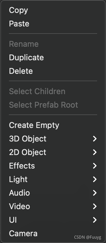 - 效果:在与被复制的游戏对象的同一层级,复制并粘贴一个游戏对象。