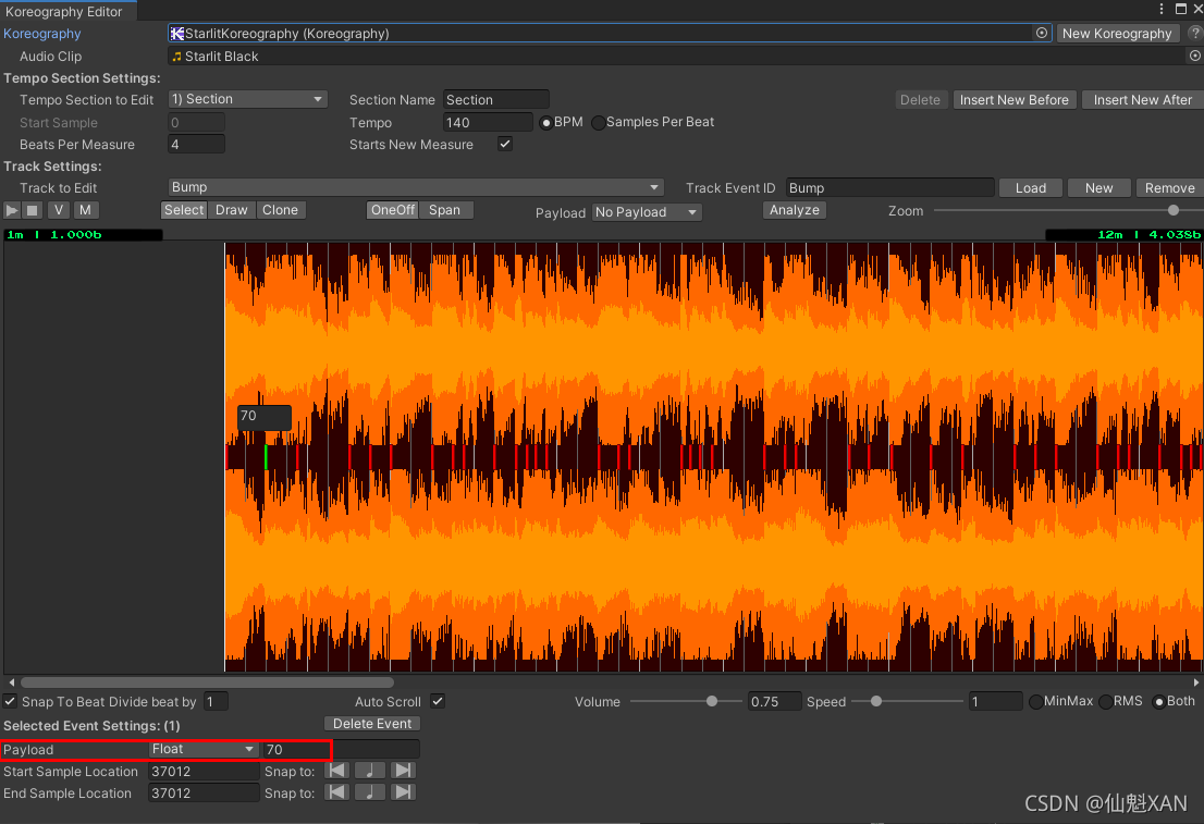 3)选中?Koreohgraphy ,点击 Open In Koreography Editor,选择对应 Koreohgraphy Track 的 Event ID,进行节拍设置,这里设置 Payload 为 float ,值可以根据需要设置大小(Demo中没有使用该值,获取可以使用 evt.GetFloatValue() 获取自己对用设置的值)