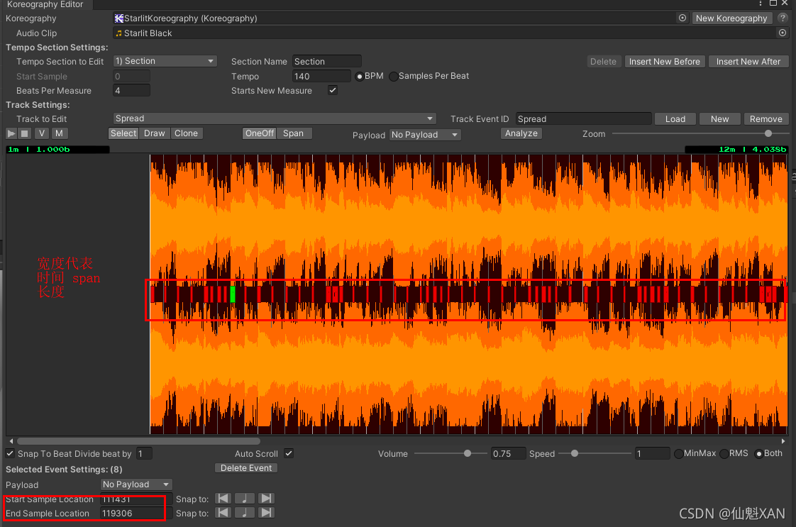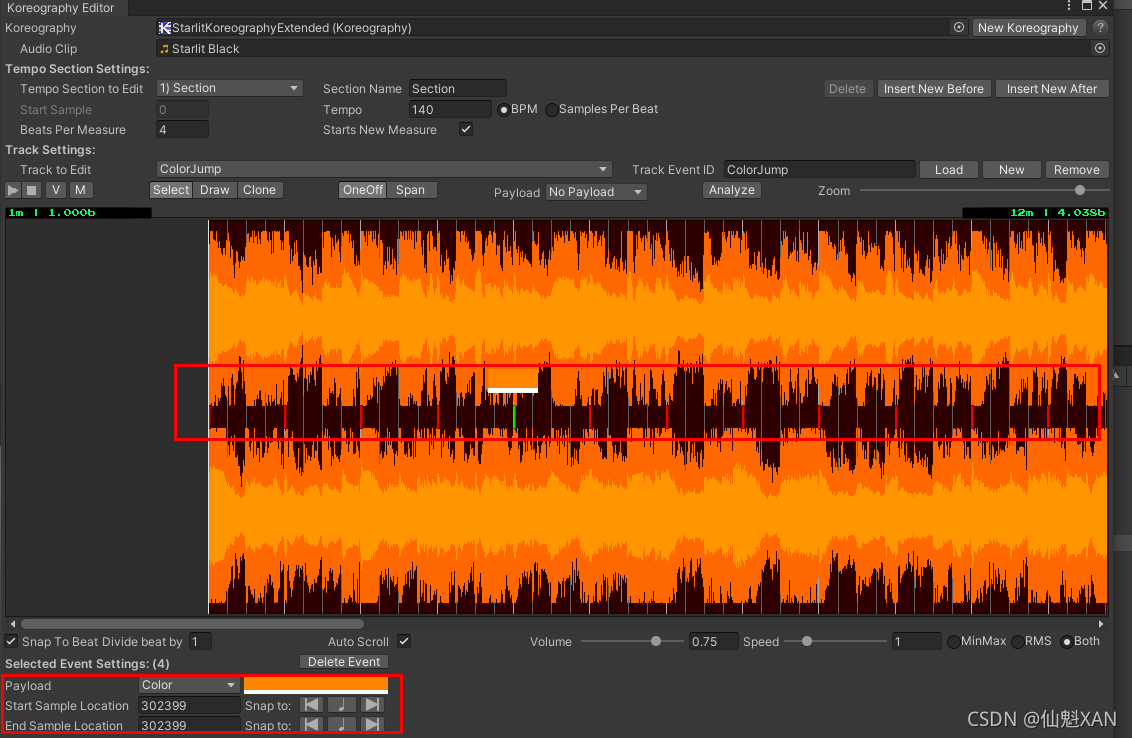 3)编辑 Koreohgraphy 对应 Koreohgraphy Track 的节拍事件,这里根据节拍,设置时间跨度