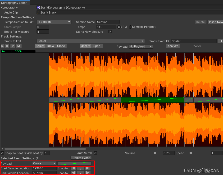 3)编辑 Koreohgraphy 对应 Koreohgraphy Track 的节拍事件,这里根据节拍,设置时间跨度上的Curve 值