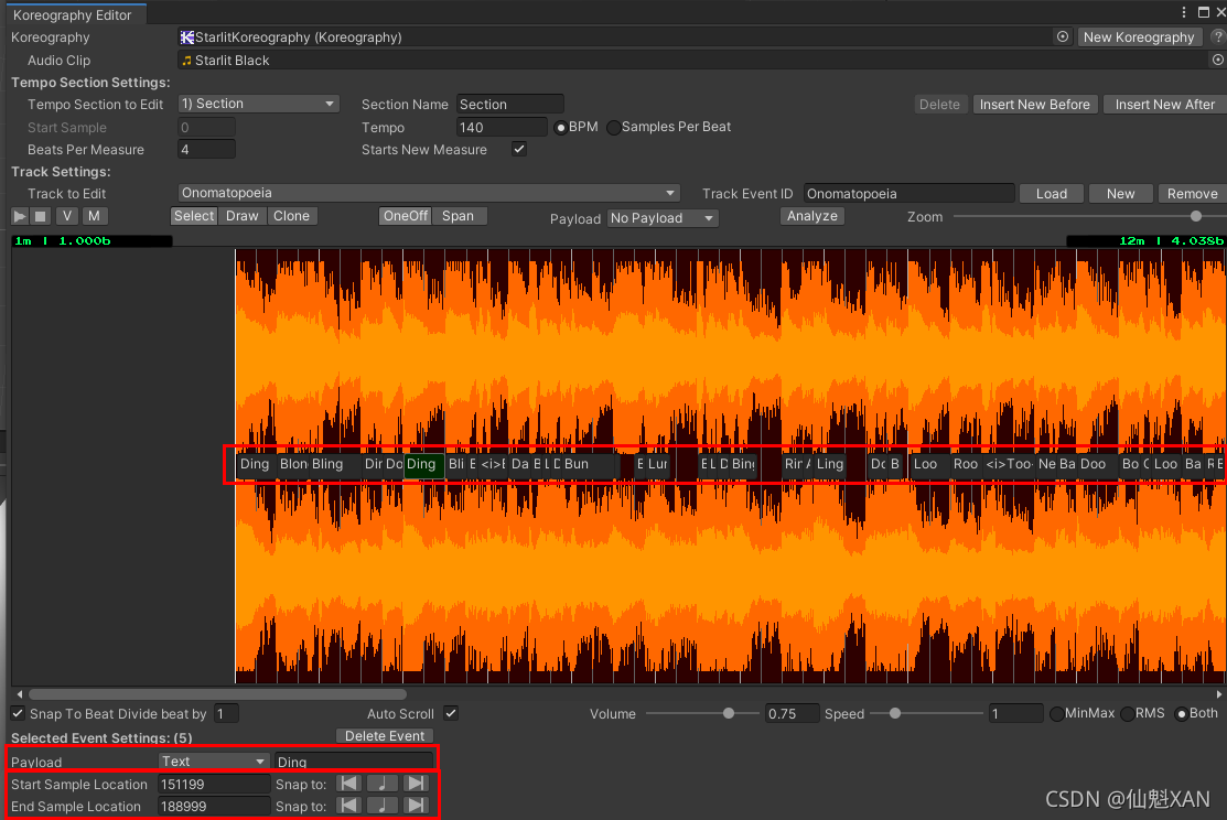 3)编辑 Koreohgraphy 对应 Koreohgraphy Track 的节拍事件,这里根据节拍,设置时间跨度上的Text 值
