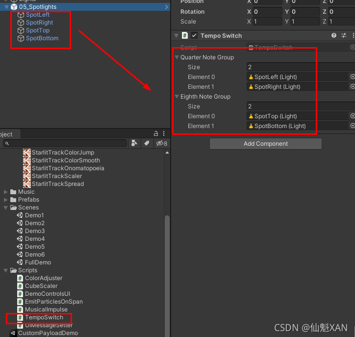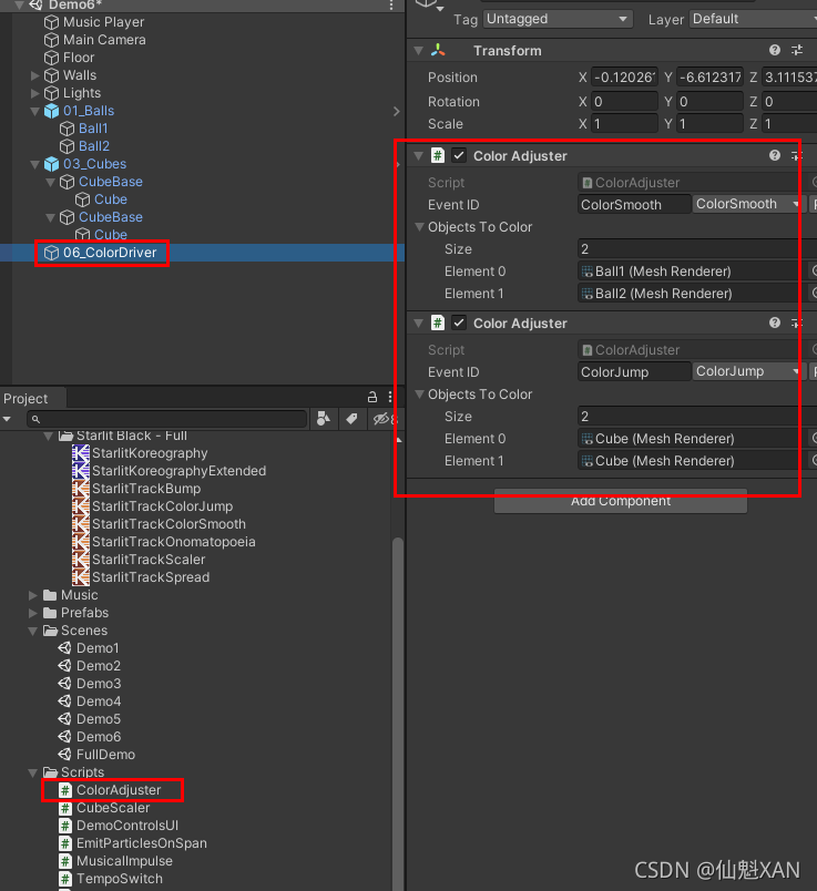 5)新建脚本,根据节拍设置颜色,脚本挂在到场景中,并对应赋值