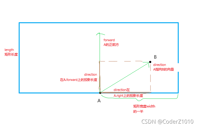 ? ? ? ? 2. 向量direction在A.forward上的投影长度小于矩形的长度length