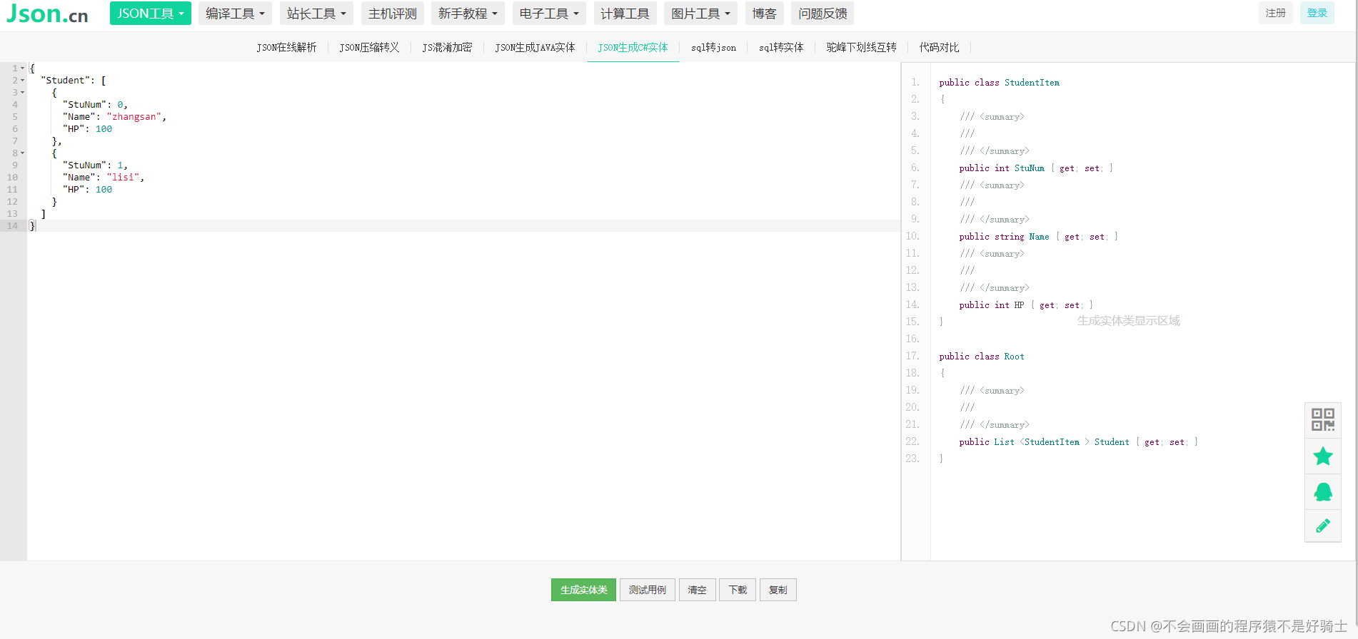 json的格式,推荐一个链接给大家,可以在线解析,查看自己编写的json文件是否正确,并且,可生成C#实体