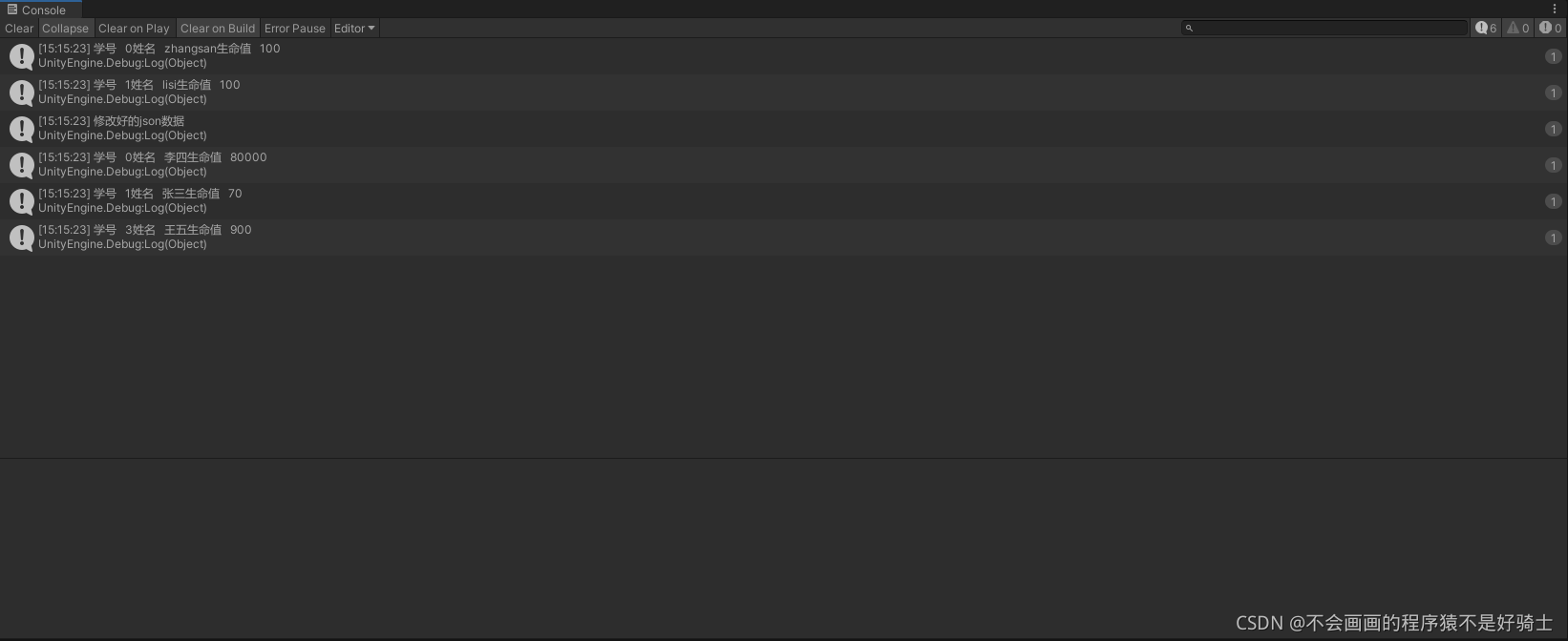 Debug.Log("学号 " + _StudentData[i].StuNum + "姓名 " + _StudentData[i].Name + "生命值 " + _StudentData[i].HP);