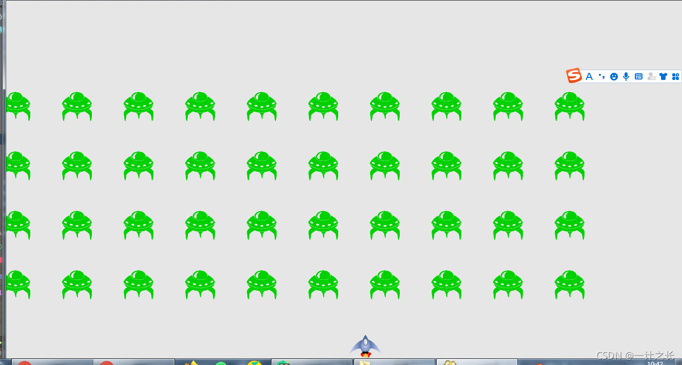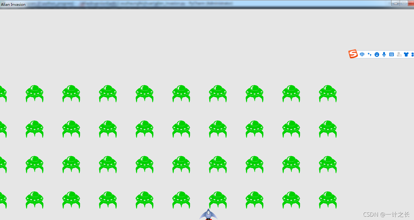 ??为让飞船居中,我们将飞船的属性center 设置为屏幕中心的x坐标,而该坐标是通过属性screen_rect 获得的。 ??这里需要我们注意的是:我们根本没有创建多艘飞船,在整个游戏运行期间。我们只创建了一个飞船实例,并在该飞船被撞到时将其居中。统计信息ships_left 让我们知道飞船是否用完。 ??如果目前运行这个游戏,射杀几个外星人,并让一个外星人撞到飞船。游戏暂停后,将出现一群新的外星人,而飞船将在屏幕低端居中。具体效果如下: