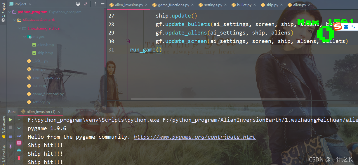 ??我们上篇文章给大家介绍了射杀外星人功能的实现,其中主要包括检测子弹与外星人碰撞,生成新的外星人群、提高子弹的速度以及最后将update_bullets() 方法进行了重构。接下来,给大家介绍了游戏结束功能的实现,主要包括检测外星人与飞船的碰撞、响应外星人和飞船碰撞以及外星人到达屏幕底端功能的实现。最后又将游戏结束和确定游戏应运行的部分做了实现。不过本文在部分代码中只写了部分代码,因为随着项目的不断扩大,代码行数太多,为了尽可能减少每篇文章的篇幅,大家阅读的方便以及尽可能将文章阅读时间控制在20分钟左右。不过,代码的准确度一定是正确的,可以跑起来的!为了让大家更好的吸收项目所用到的知识点,我们每一篇文章只给大家实现《外星人入侵》的一个功能,所以,希望大家能够仔细阅读,认真跟着写代码,理解其中的深入含义,吧这个项目的价值发挥到最大。其实这个项目已经很典型,代码到处都是,但是,如果你只是简单的粘贴复制,对你知识的学习没有任何的价值,你还是得跟着过一遍,然后要知道每行代码的含义或者是用到了前面我们介绍的哪一块知识点,只有这样,这个项目才会发挥不一样的价值,希望大家认真学习,把基础知识打扎实一点。Python是一门注重实际操作的语言,它是众多编程语言中最简单,也是最好入门的。当你把这门语言学会了,再去学习java、go以及C语言就比较简单了。当然,Python也是一门热门语言,对于人工智能的实现有着很大的帮助,因此,值得大家花时间去学习。生命不息,奋斗不止,我们每天努力,好好学习,不断提高自己的能力,相信自己一定会学有所获。加油!!!