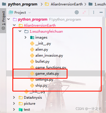 ??现在需要确定外星人与飞船发生碰撞时,该做些什么呢。我们不销毁Ship 实例并创建一个新的ship 实例,而是通过跟踪游戏的统计信息来记录飞船被撞多少次(跟踪统计信息还有助于计分)。 ??下面来编写一个用于跟踪游戏统计信息的新类——GameStats ,并将其保存为文件game_stats.py 中,其Python文件目录机构如下:  ??具体实现该函数如下: