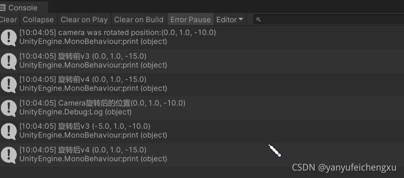Debug.Log("Camera旋转后的位置" + transform.position);