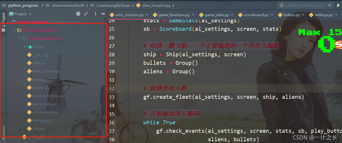 ??我们的项目首先是武装飞船实现,我们通过四篇文章将其实现。其次是通过五篇文章实现外星人的功能;最后通过三篇文章实现记分的部分。接下来,我们讲给大家呈现本项目的全部完整代码;