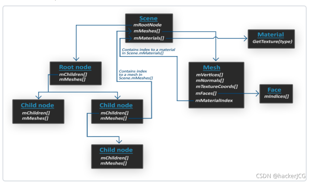- 场景的Root node(根节点)可能包含子节点(和其它的节点一样),它会有一系列指向场景对象中mMeshes数组中储存的网格数据的索引。Scene下的mMeshes数组储存了真正的Mesh对象,节点中的mMeshes数组保存的只是场景中网格数组的索引。
