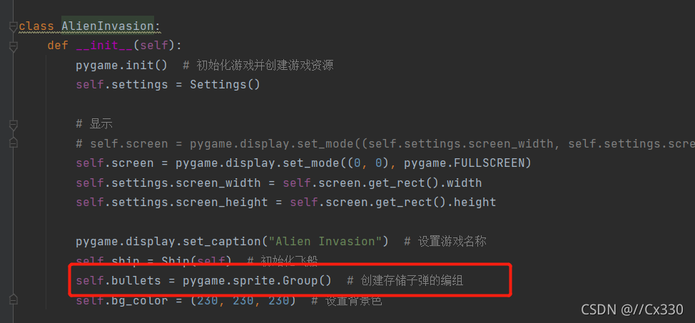 这个编组用于存储所有有效的子弹,以便管理发射出去的子弹,它是pygame.sprite.Group类的一个实例。pygame.sprite.Group类似于列表,但提供了有助于开发游戏的额外功能。在主循环中,将使用这个编组在屏幕上绘制子弹以及更新每颗子弹的位置。